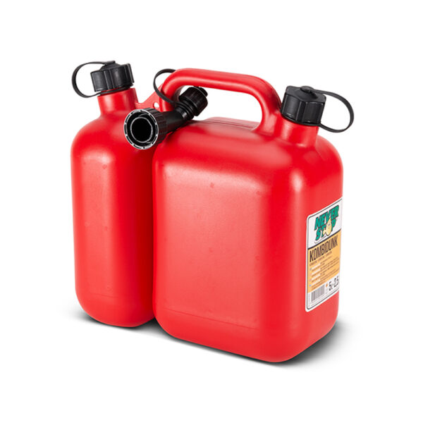 A large combi-can that holds both 5 liters of fuel and 2.5 liters of oil. With a large handle that makes it easy to carry. Comes with flexible filling spout. Approved according to the UN.