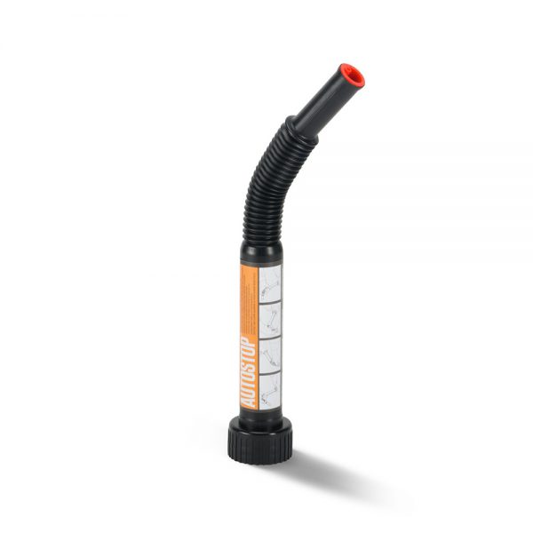 Never Stop filler spouts prevent flashback explosions, unnecessary spillage and overfilling. The AutoStop function counteracts overfilling by closing a valve and stopping the flow when the vessel is full. The built-in flame barrier avoids flashback explosions from occurring when sparks, which can occur when fuel is poured on fire, ignite the vapors around the fuel can, causing an explosion.